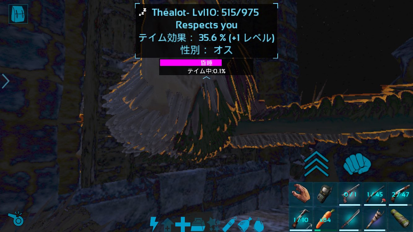 スルタン Easy Lv4 グリフォン 職人のクロスボウ 毒矢 15 癒し効果がある香料 1 餌 アロサウルスの卵 10 麻酔薬 150 アイテム数ははっきりと数えていないのでおおよその数 テイム効果の 値が下がったんだけど 餌ってパソコン版と同じで